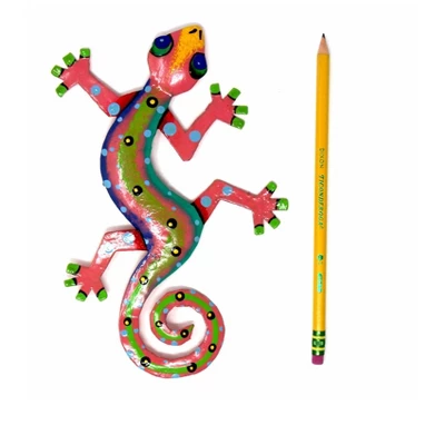 This gecko is handmade in Haiti from recycled oil drums. Each has a small hook to hang the piece and is painted with a bright colorful design inspired by the local Haitian culture. From head to tail, the gecko is 8 inches long.