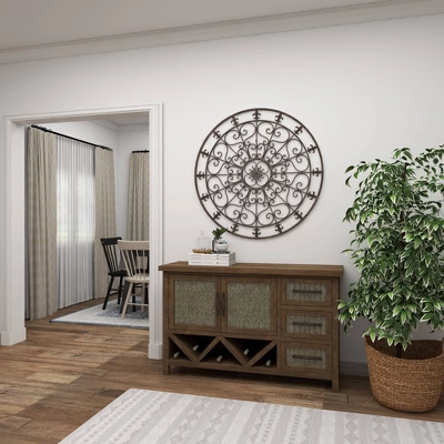- •Black metal scroll wall decor features a round shape design with fleur de lis patterns
