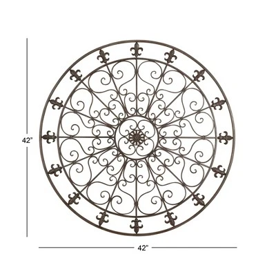 Add texture and balance on your wall space with this circular scroll and fleur de lis metal wall decor. This item ships in 1 carton. Adorned with thirteen fleur de lis iron plaques surrounding the round sculpture like clock numbers. Can be hung vertically using a hanging hooks; hook, nails and screws not included. Suitable for indoor use only. This item ships fully assembled in one piece. This is a single black colored wall sculptures. Rustic style.